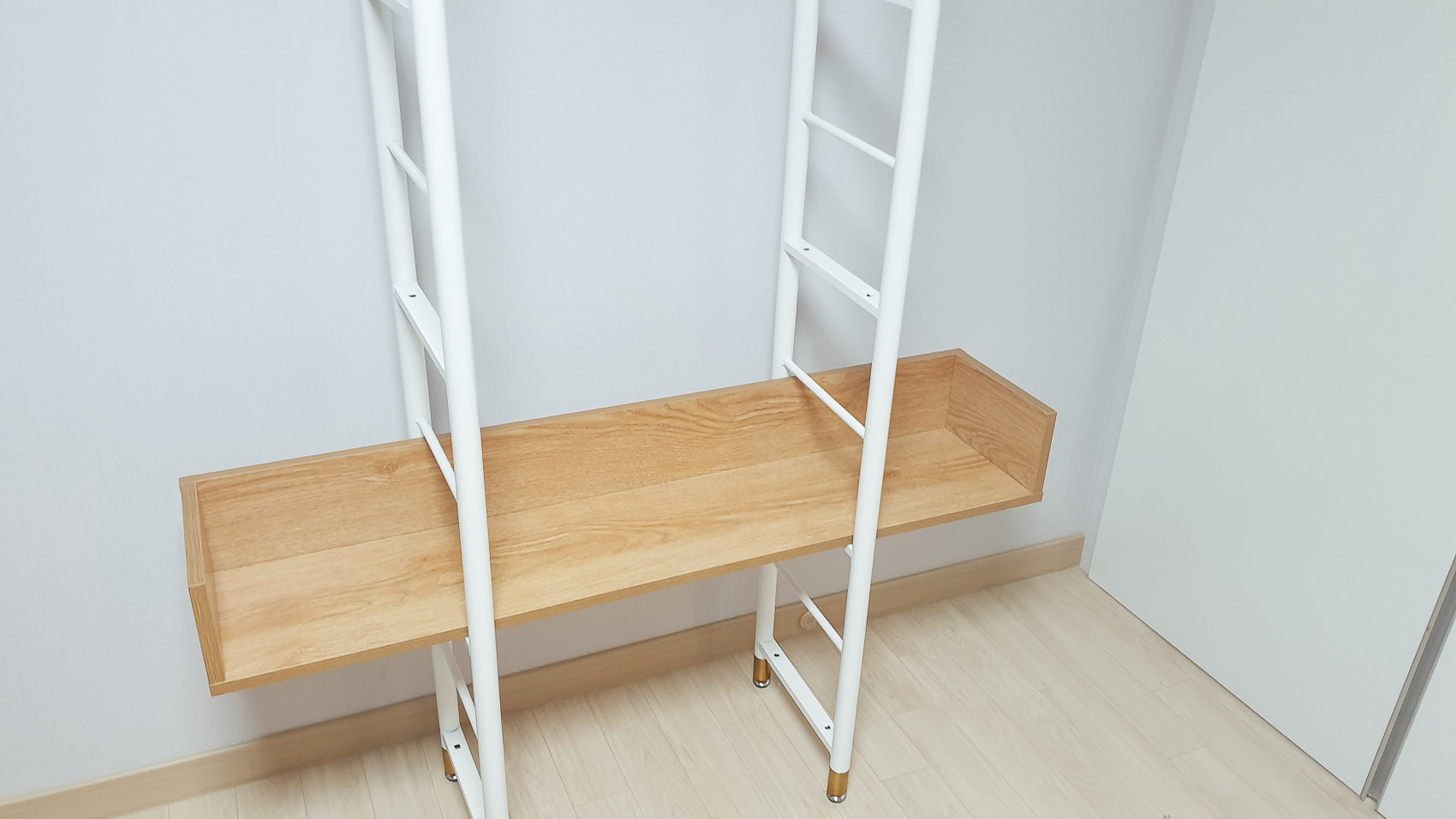 조립 순서에 맞게 최초에 측판의 높이 조절이 가능한 받침대를 체결해준다. 벽면에 살포시 기대어 하나둘씩 체결해주면 된다.