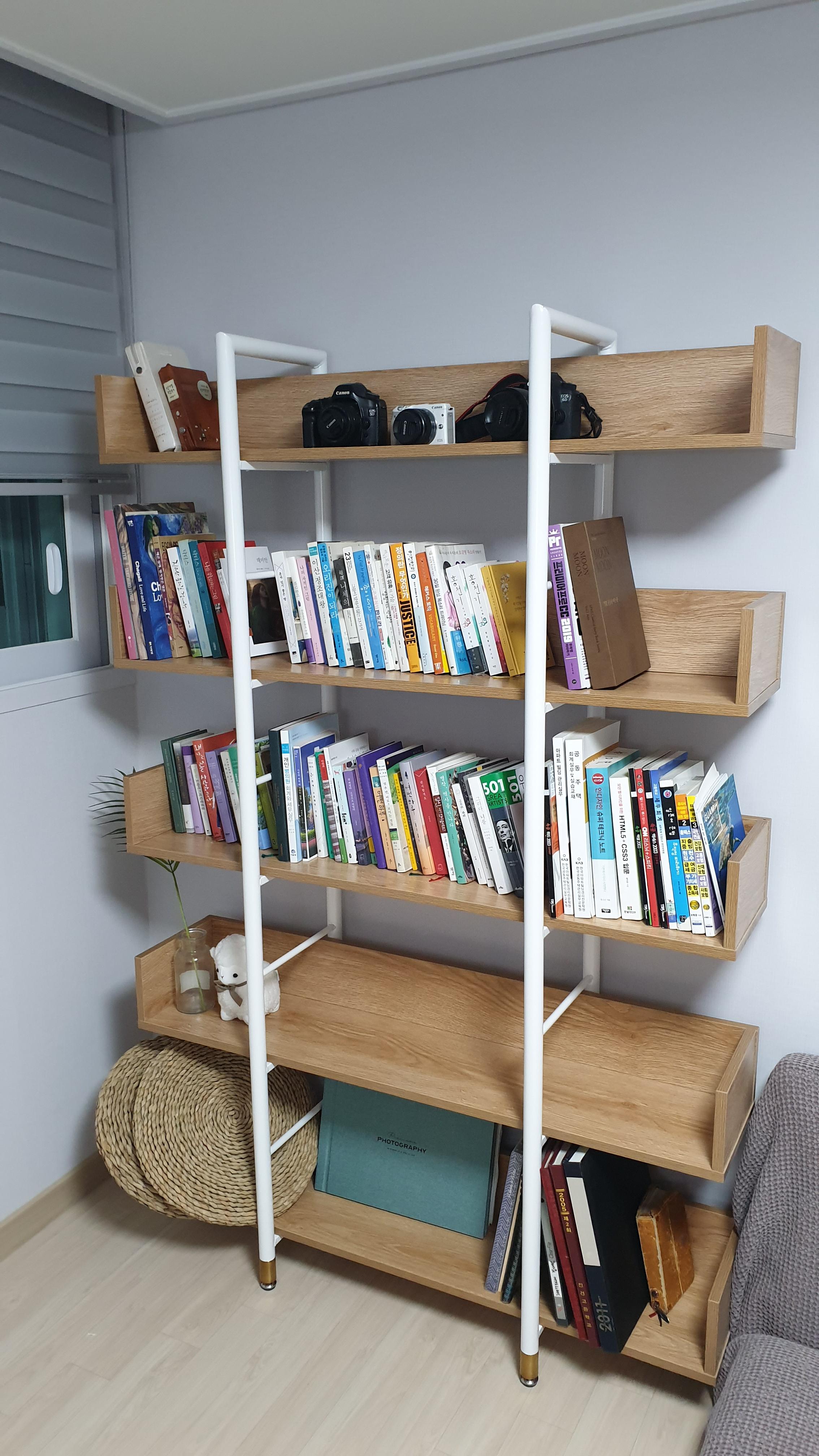 모션 퍼니처 SD 원형 스틸 5단 거실 책장을 완성하고, 하나둘씩 각방에 붙박이장에 흩어져있던 책들을 모았다.