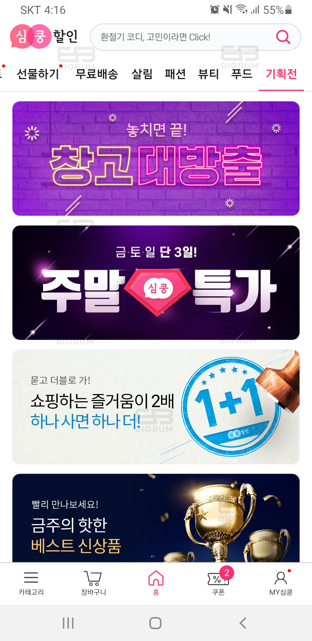 앱에는 기획전 및 이벤트와 일간, 주간, 월간 베스트 항목으로 되는 메뉴가 있다. 주기적으로 앱을 사용한다면 필요했던 품목을 최저가로 만나볼 수 있는 기회이다.