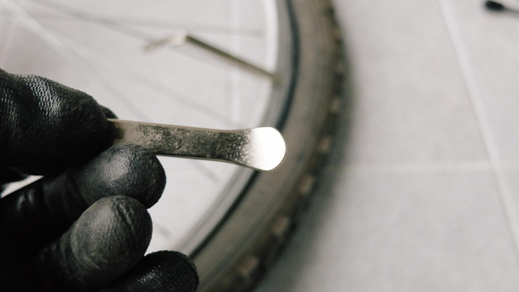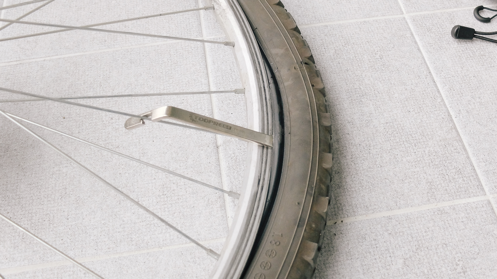 어느 정도 바람이 빠졌다고 생각된다면 타이어와 휠 사이에 구매해둔 1개의 튜브 교체 주걱을 끼어준 뒤 걸어놓아 고정하도록 한다. 나머지 교체 주격으로 도려내듯이 밀어줘야 하기 때문에 1개의 교체 주걱이 고정되어 잡아주는 역할을 수행해야 한다.