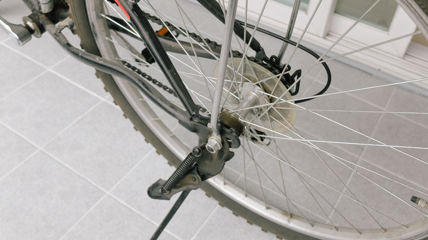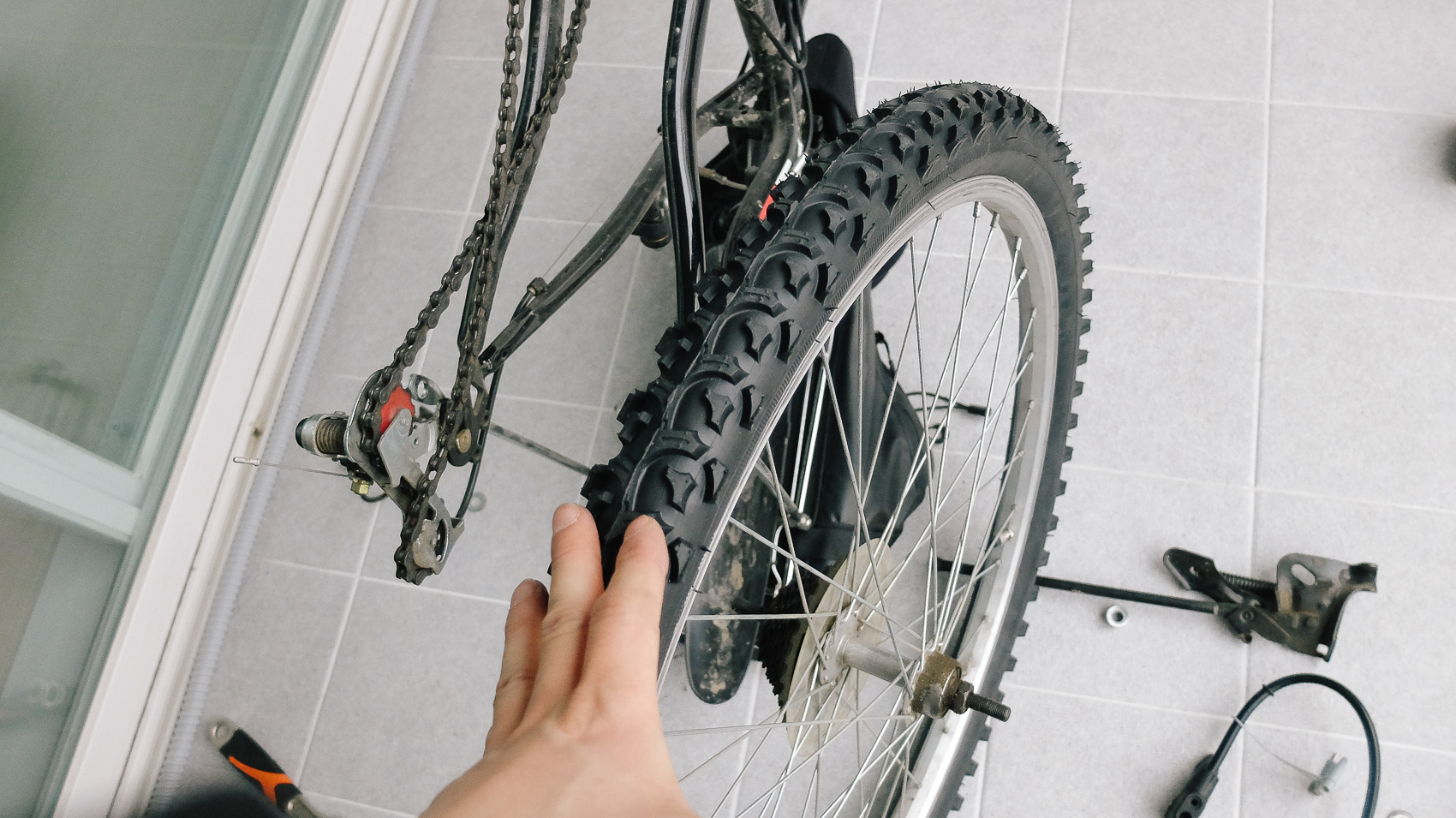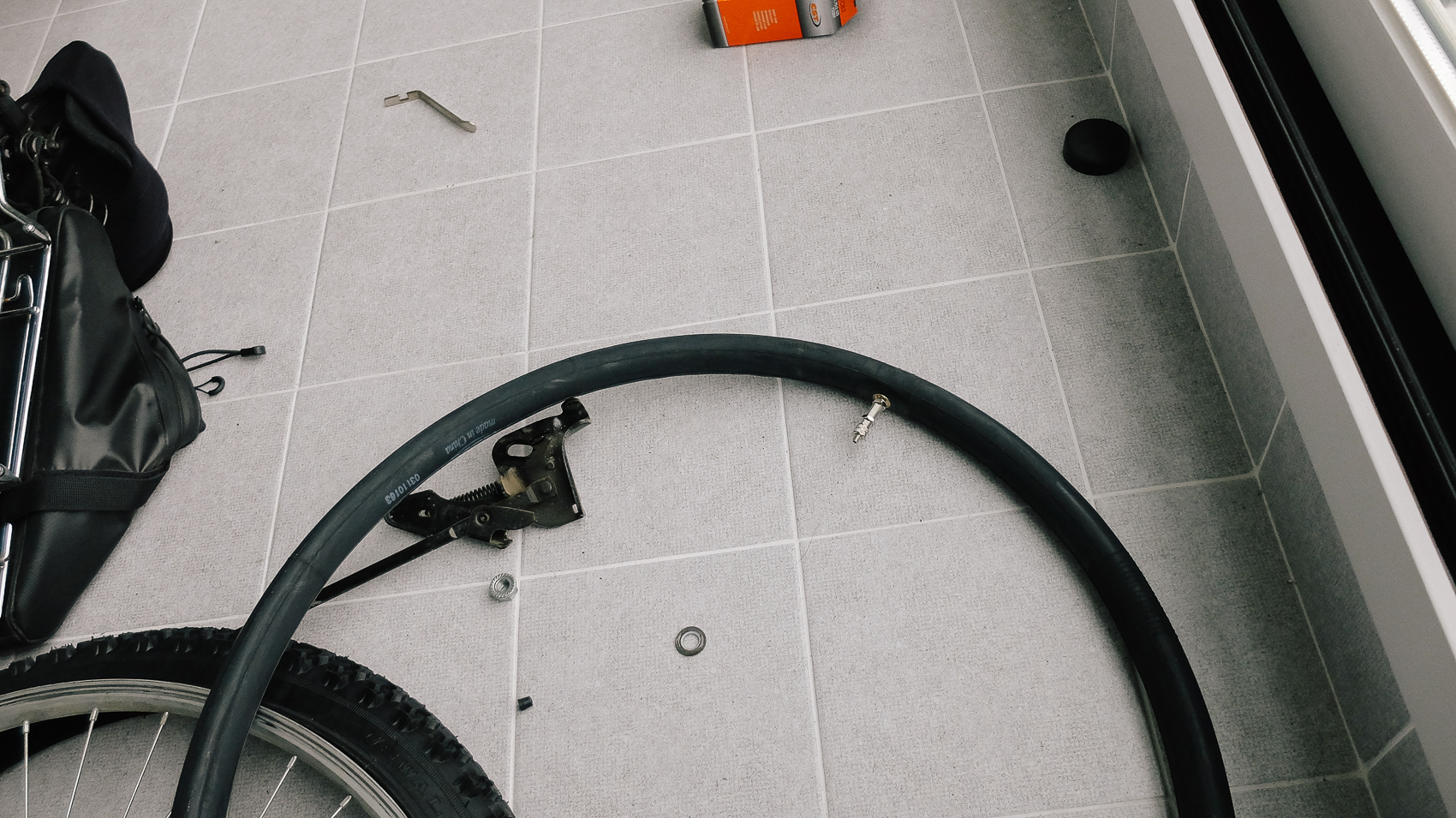 해체된 뒷바퀴의 타이어와 튜브를 빼기 위해서는 먼저 타이어 튜브의 바람을 빼준다. 바람이 빠진만큼 유격이 생기기 때문에 바람이 꽉 차있는 상태에서 제거하기란 불가능에 가깝다고 할 수 있다.