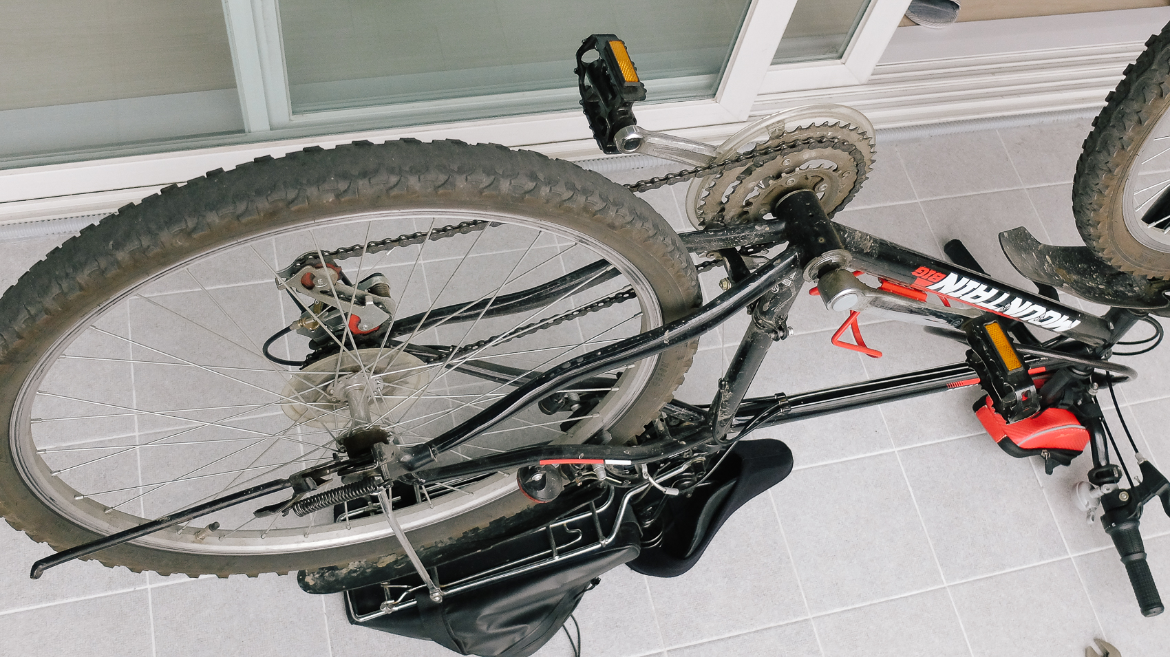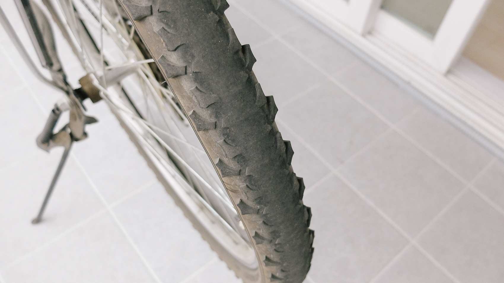 자전거 페탈을 구르면 뒷바퀴부터 회전해서 인지 앞바퀴 컨디션과 너무나 상반된 컨디션을 보이고 있었다. 뒷바퀴의 표면은 사진과 같이 굉장히 마모가 된 상태.
