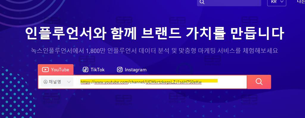 ① 먼저 하단의 링크로 접속하여 위와 같이 유튜브 탭을 클릭 후 검색창에 유튜브 채널 url 링크 주소를 복사 붙여넣기 한 뒤 검색 아이콘을 클릭한다.