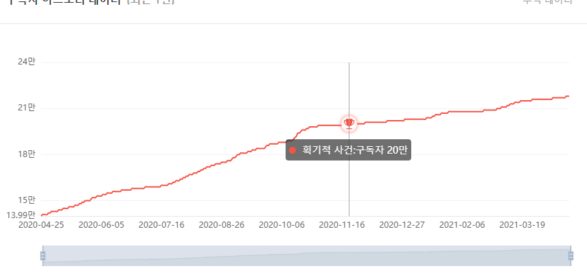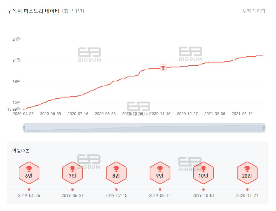 또한 월 수익예측 외 구독자 히스토리 데이터, 채널 통계표, 조회수 히스토리 데이터 등 최근 1년간의 정보를 확인할 수 있다. 구독자 히스토리 데이터에서 트로피 아이콘이 생긴 지점은 유튜브에서 특정한 범위를 표시해놓은 것이라고 볼 수 있다.