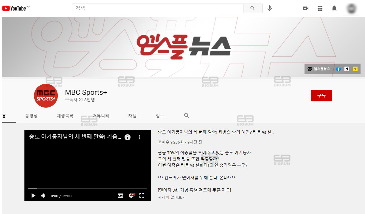 ② 수익 구조를 체크하기 위해 어느정도어느 정도 인지도가 있는 채널을 임시로 확인해 보았다. MBC Sports+ 채널이며, 구독자수는 218,000명에 육박한다. 과연 이 유튜브 채널의 수익은 대략적으로 어느 정도가 발생될까? 해당 채널의 url를 복사해둔 뒤 녹스 인플루언서 웹사이트로 접속한다.