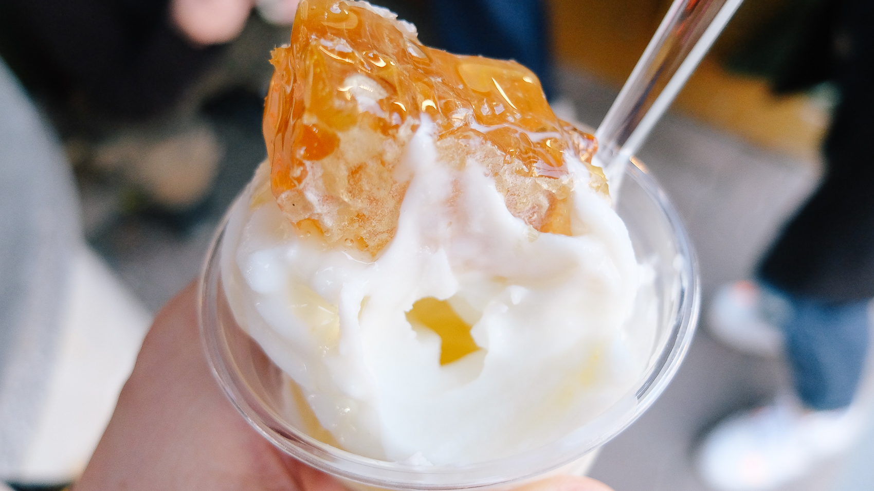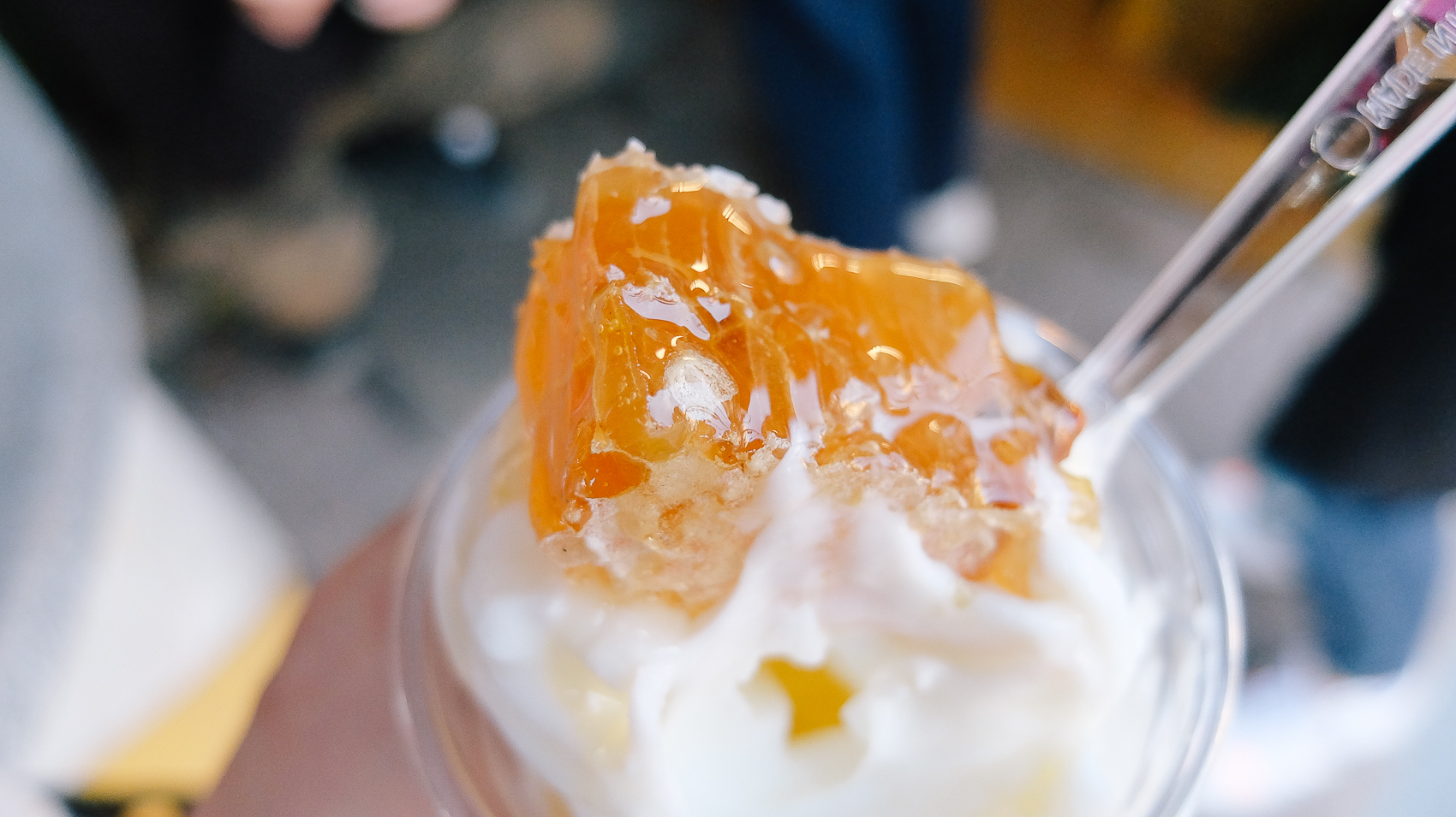 아이스크림을 컵에 담으면서 동시에 꿀 시럽을 컵 벽면에 둘러주어 아이스크림에 골고루 꿀이 묻게끔 해주고, 마지막 적당한 크기로 잘라낸 벌꿀집을 얹히면 끝! 달콤한 비주얼만큼이나 맛도 어마 무시했다..ㅋㅋㅋ
