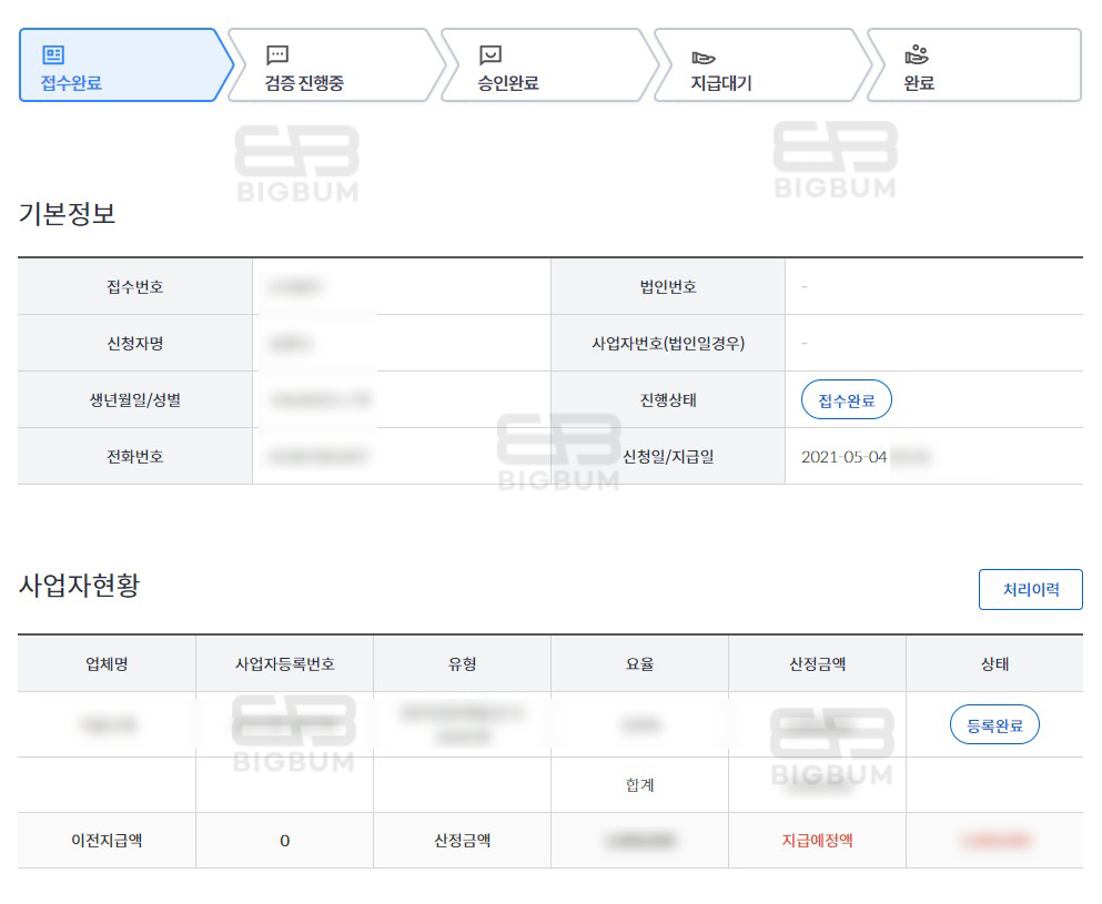 ⑥ 신청과 동시에 소상공인 버팀목자금 플러스 접수되어 사업자 현황에서 신청 및 지급예정액이 보여진다.