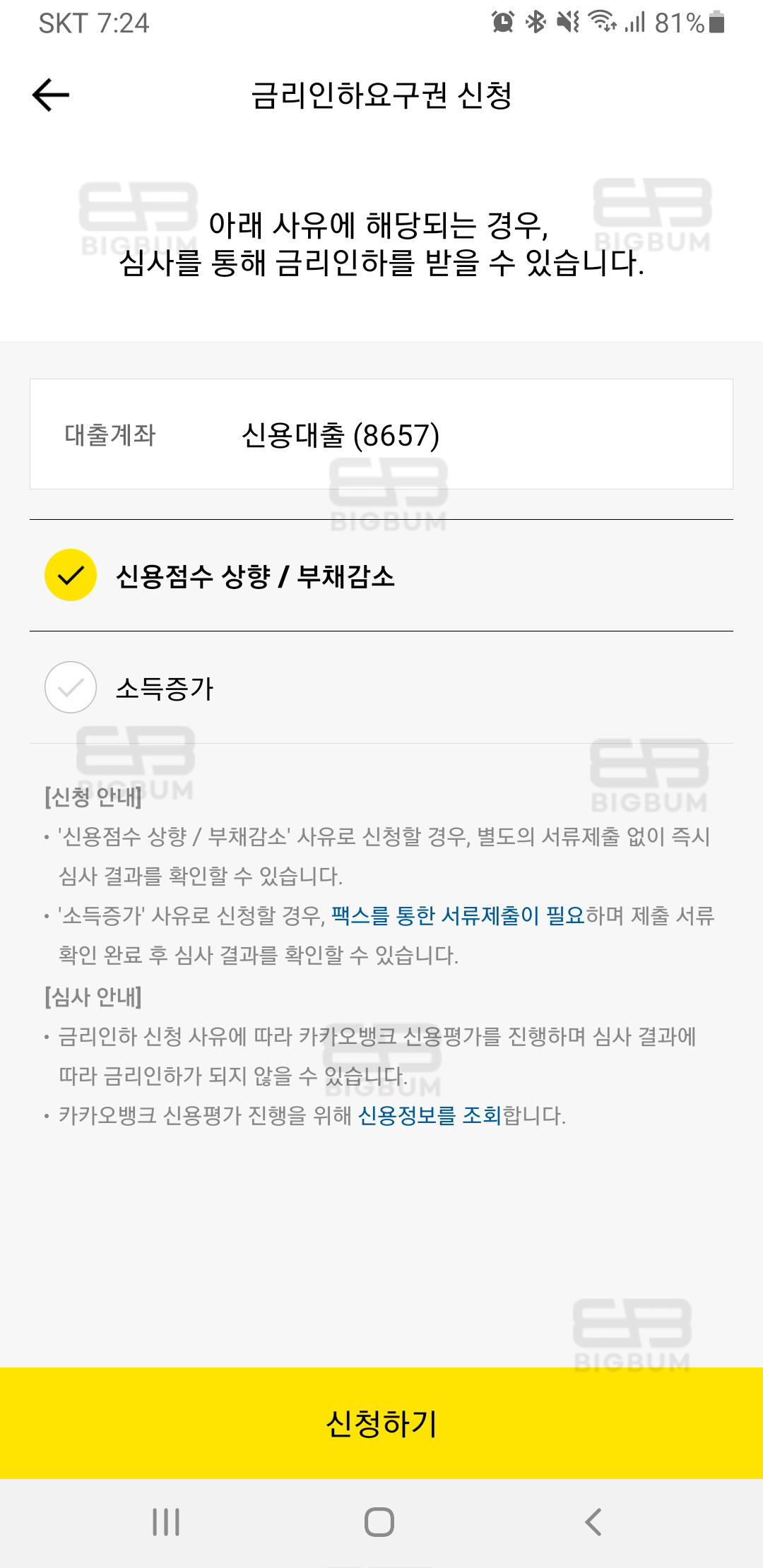 나는 별도의 서류제출없이 즉시 심사결과를 알 수 있는 신용점수 상향/부채 감소를 선택 후 신청하기 버튼을 눌렀다.