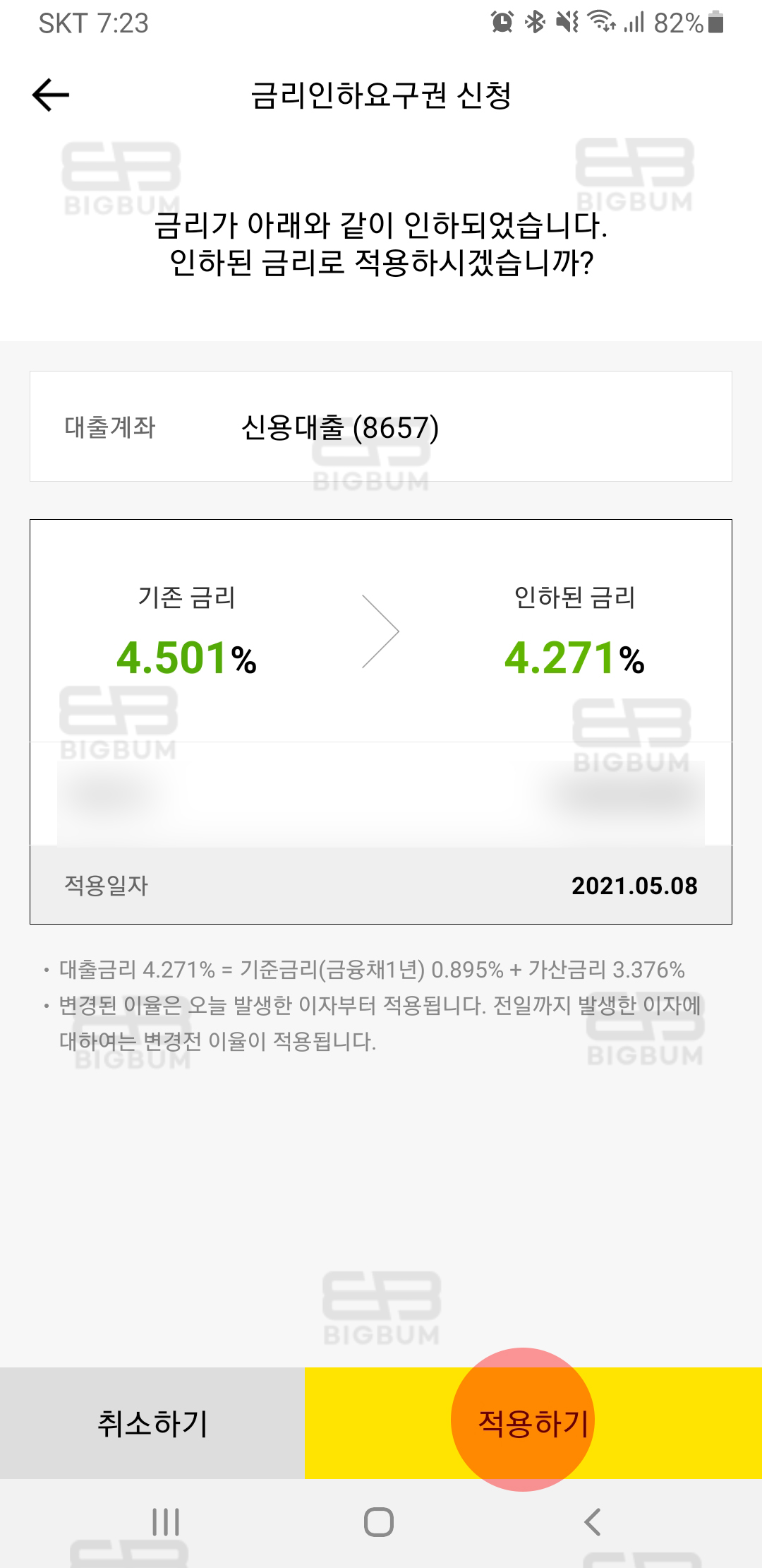 ④ 개인확인 인증 후 바로 변경된 금리 내용이 보이게 되고, 적용 시 오늘 발생한 이자부터 적용이 된다고 기재되어 있다. 그대로면 어쩌나 했는데 다행히 0.2 이상 금리인하가 있어 바로 적용하기 버튼을 클릭했다.