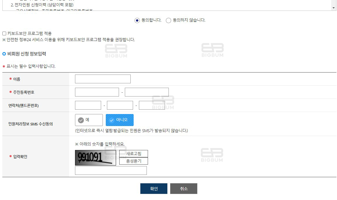 ④ 개인정보 수집 안내 등에 동의란에 체크, 비회원 신청 정보 입력 후 확인 버튼을 클릭한다.