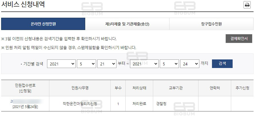 잠깐은 로딩 화면이 순차적으로 진행되고 접수 처리가 완료된다.