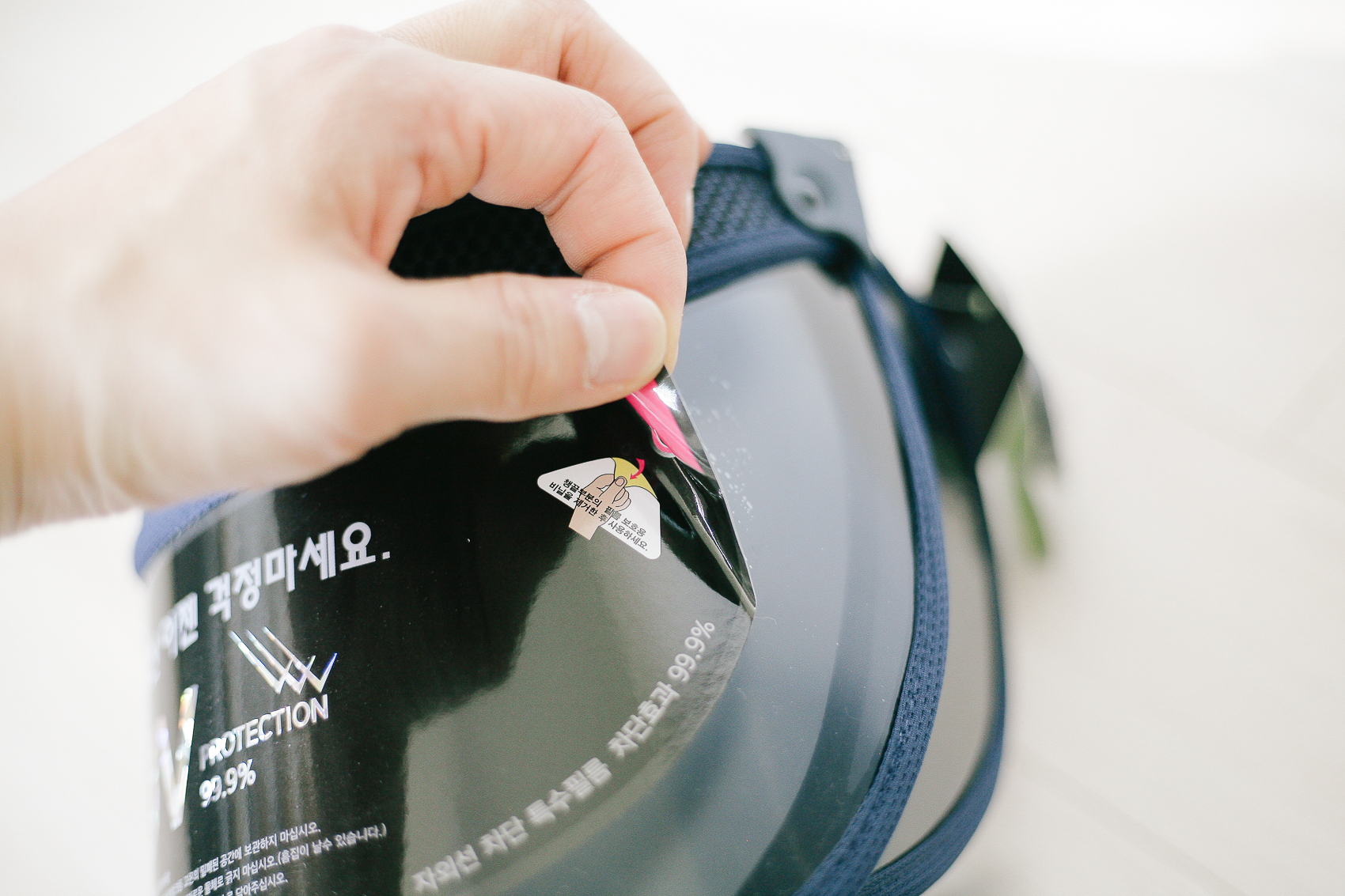 썬캡 챙에 부착된 스티커를 제거하고 사용해야 하는데, 생각보다 스티커가 고착화되어 떼어내면서 선캡 자체의 특수 필름도 살짝 일어나는 곳이 있었다. 때문에 천천히 살살 기포가 생기지 않도록 잘 제거하길 권장한다. 첨에 눈치 못 채고 빠르게 벗겼다가.. 기포만 무지하게 생겼다.
