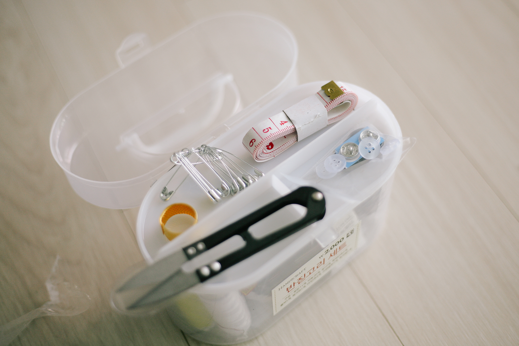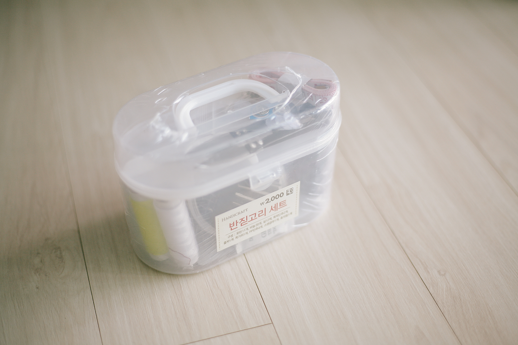 가격은 단돈 2,000원! 구성으로는 옷핀 11개, 줄자, 쪽가위, 스텐 골무, 똑딱단추 2개/ 투명 단추 2개, 실 꿰기, 실 12색, 바늘 20개이다.
