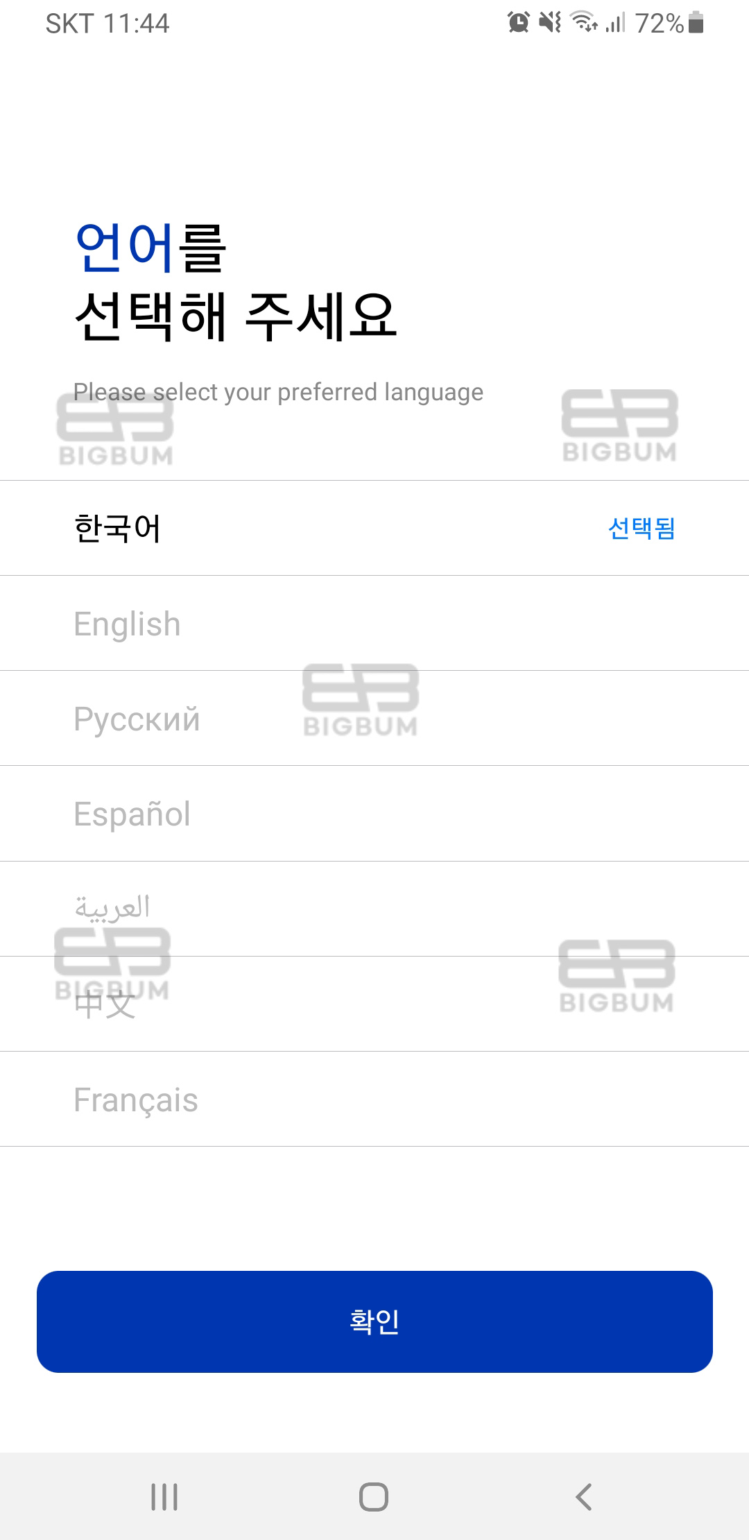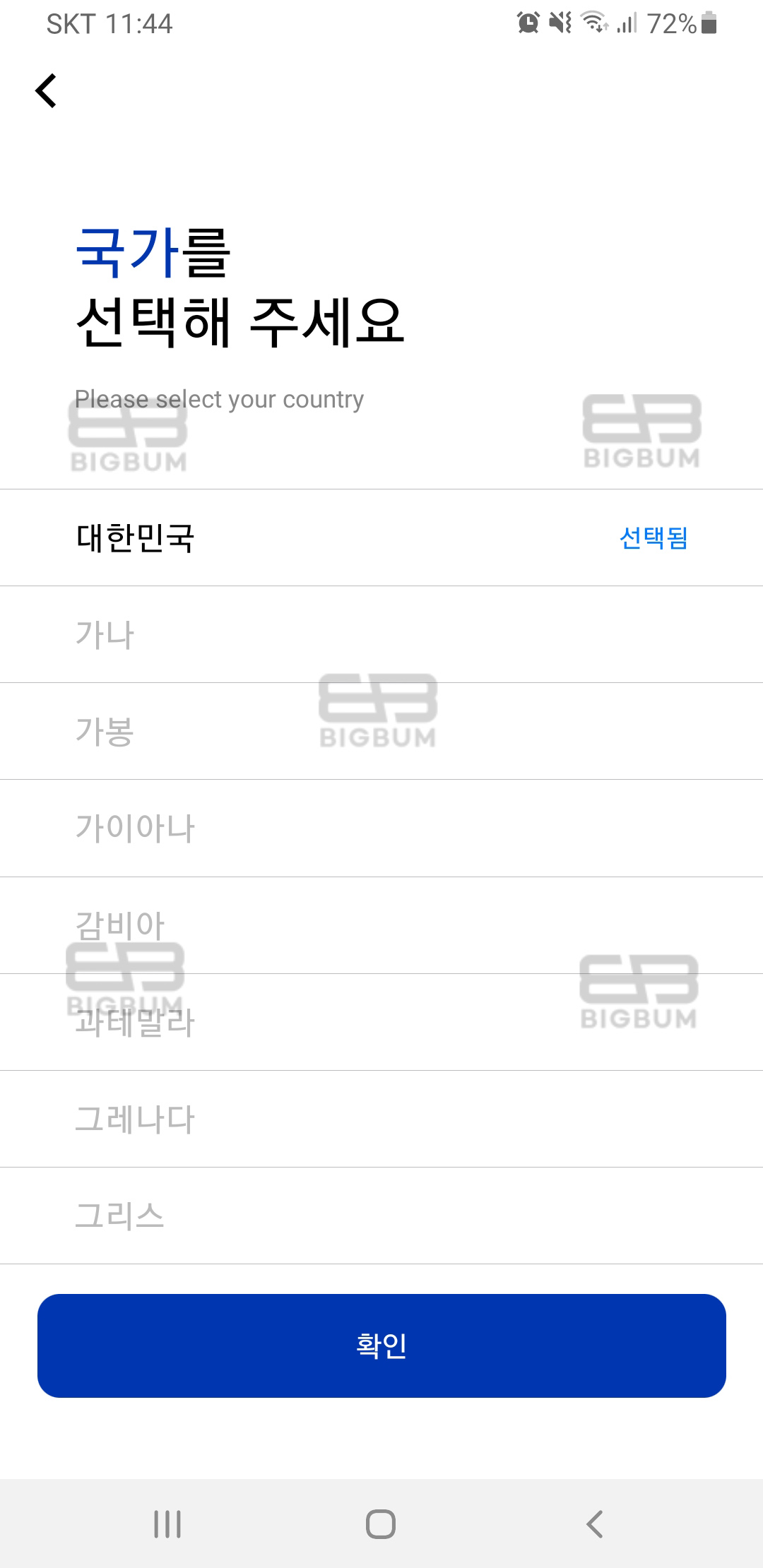 ② 설치완료 후 앱을 실행하여 언어 선택 및 국가를 선택해준다. 해당 앱은 세계 각국에서 사용이 가능하다.