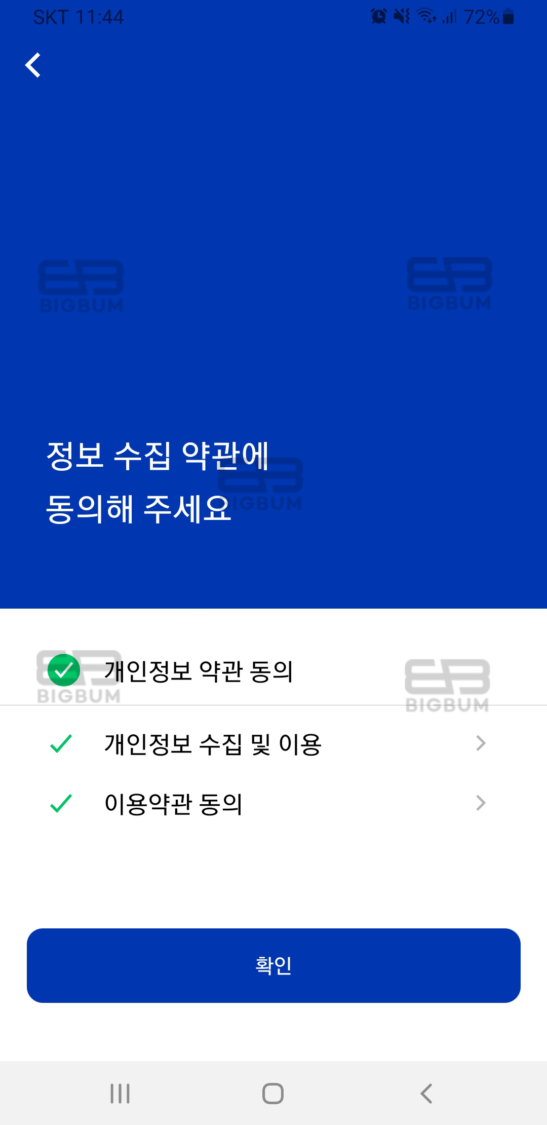 ④ 마지막으로 개인정보 약관 동의 완료 후 본인인증을 완료한다.(휴대폰 인증 등)
