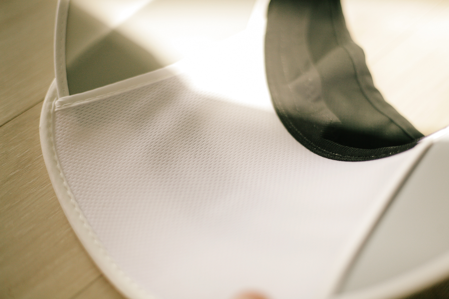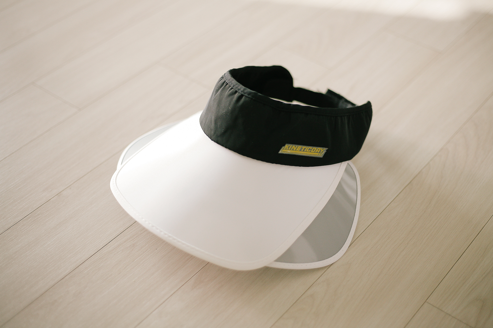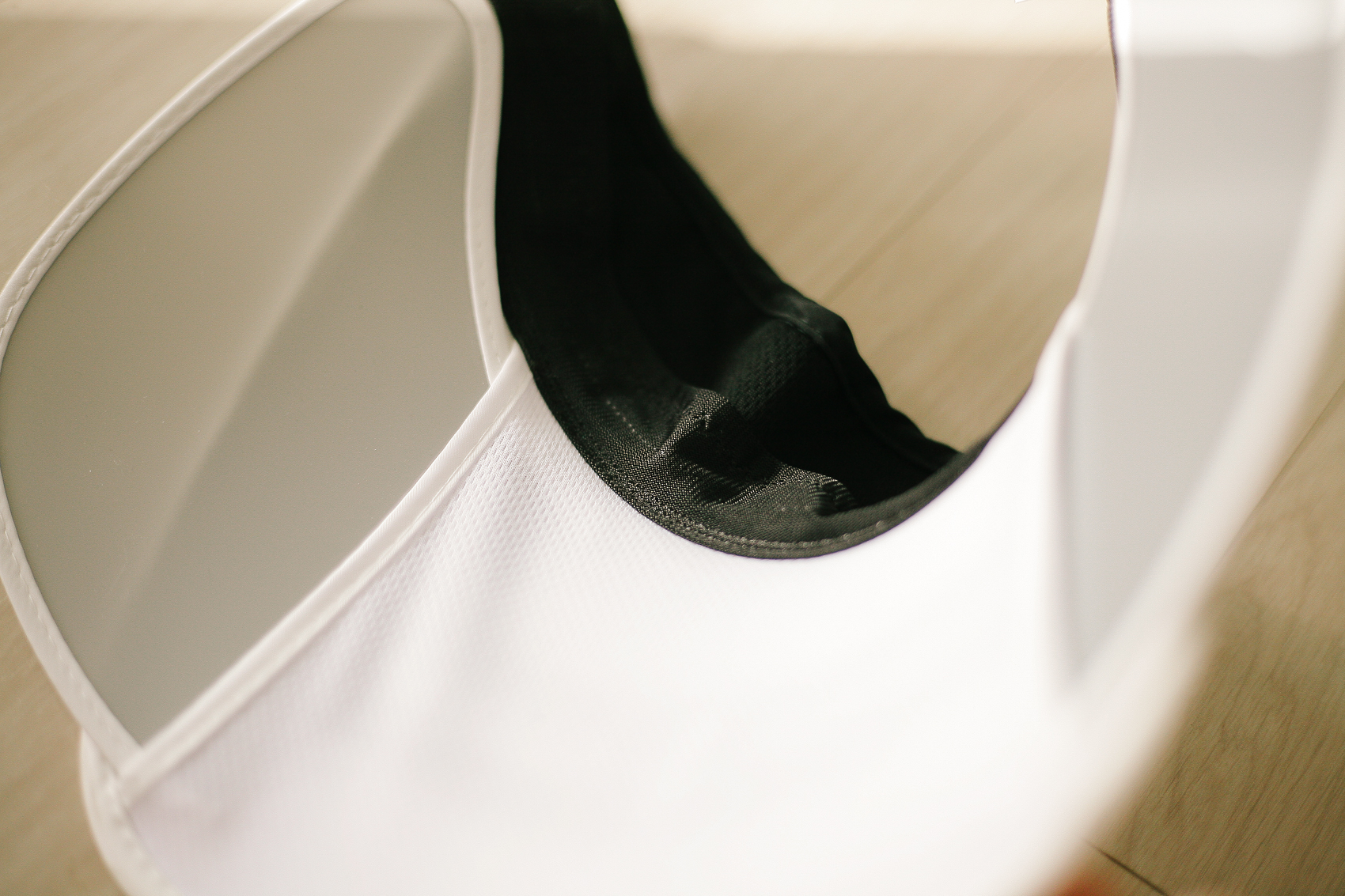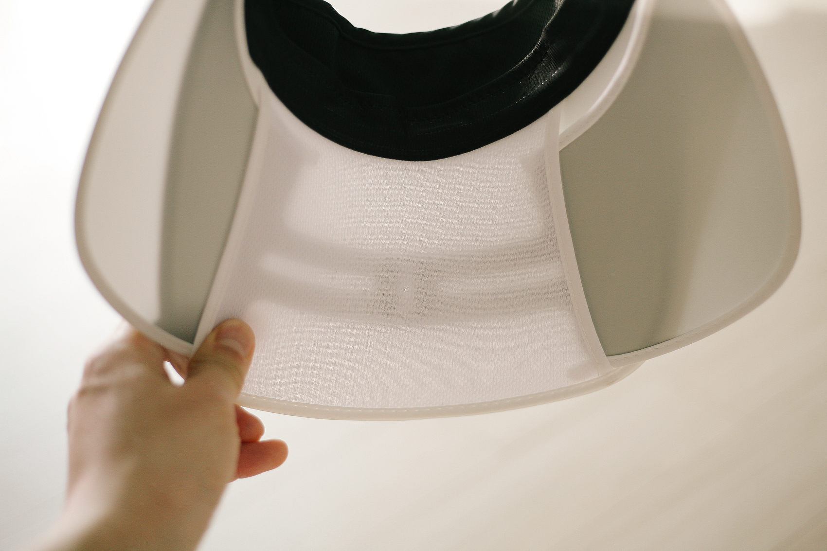 좌우 가리개를 펼쳐놓은 모습. 머리를 두르는 밴딩부분은 검정으로 되어 있어서 땀이 나도 티가 나지 않는다. 챙 부분처럼 동일한 흰색이었다면 사실 구매하는데 많이 주저했을 것 같았다.