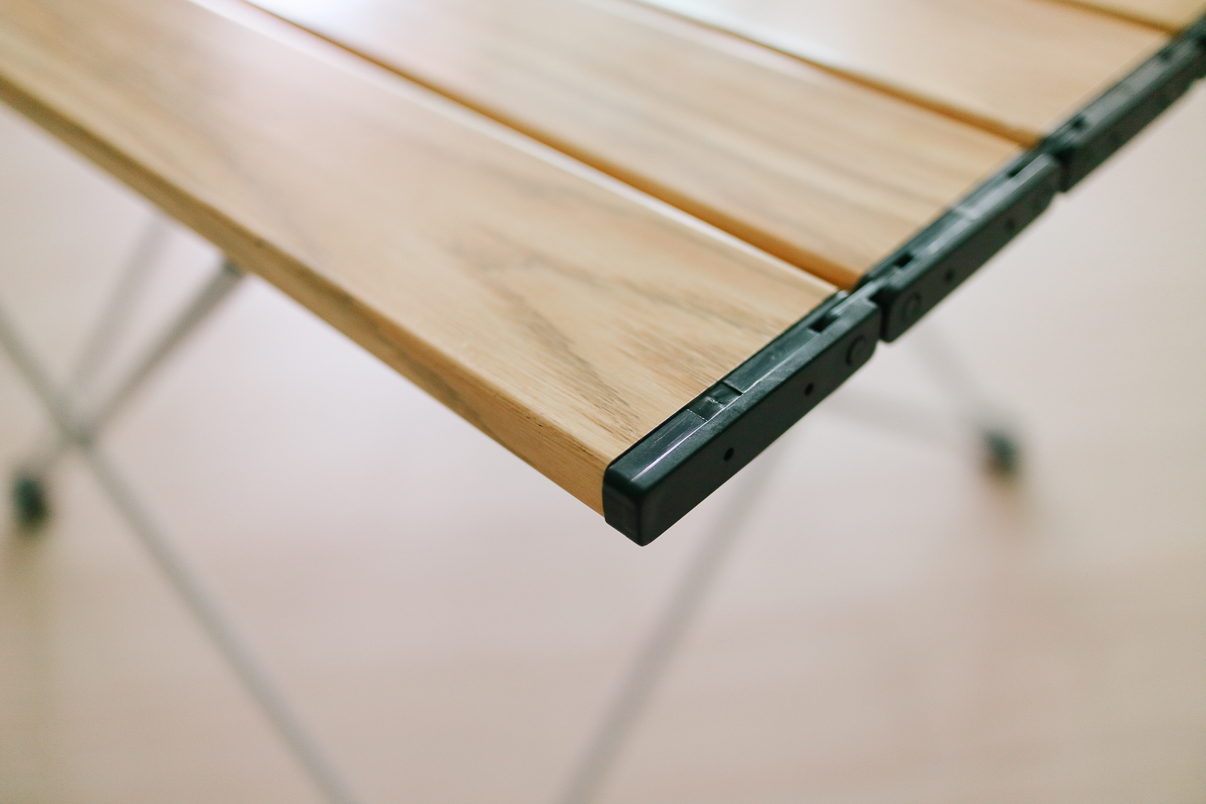구성품은 다리 프레임, 알루미늄 상판, 수납 파우치, 포장박스으로 이루어져 있다. 제품을 개봉하면 프레임과 알루미늄 상판이 포개져 있다. 프레임을 펼치면서 2개의 프레임 바를 거치하게 되면, 테이블 다리가 완성되며 상판을 펼쳐서 끝 라인 홈에 맞게 끼워주면 쉽게 캠핑 테이블을 조립할 수 있다.