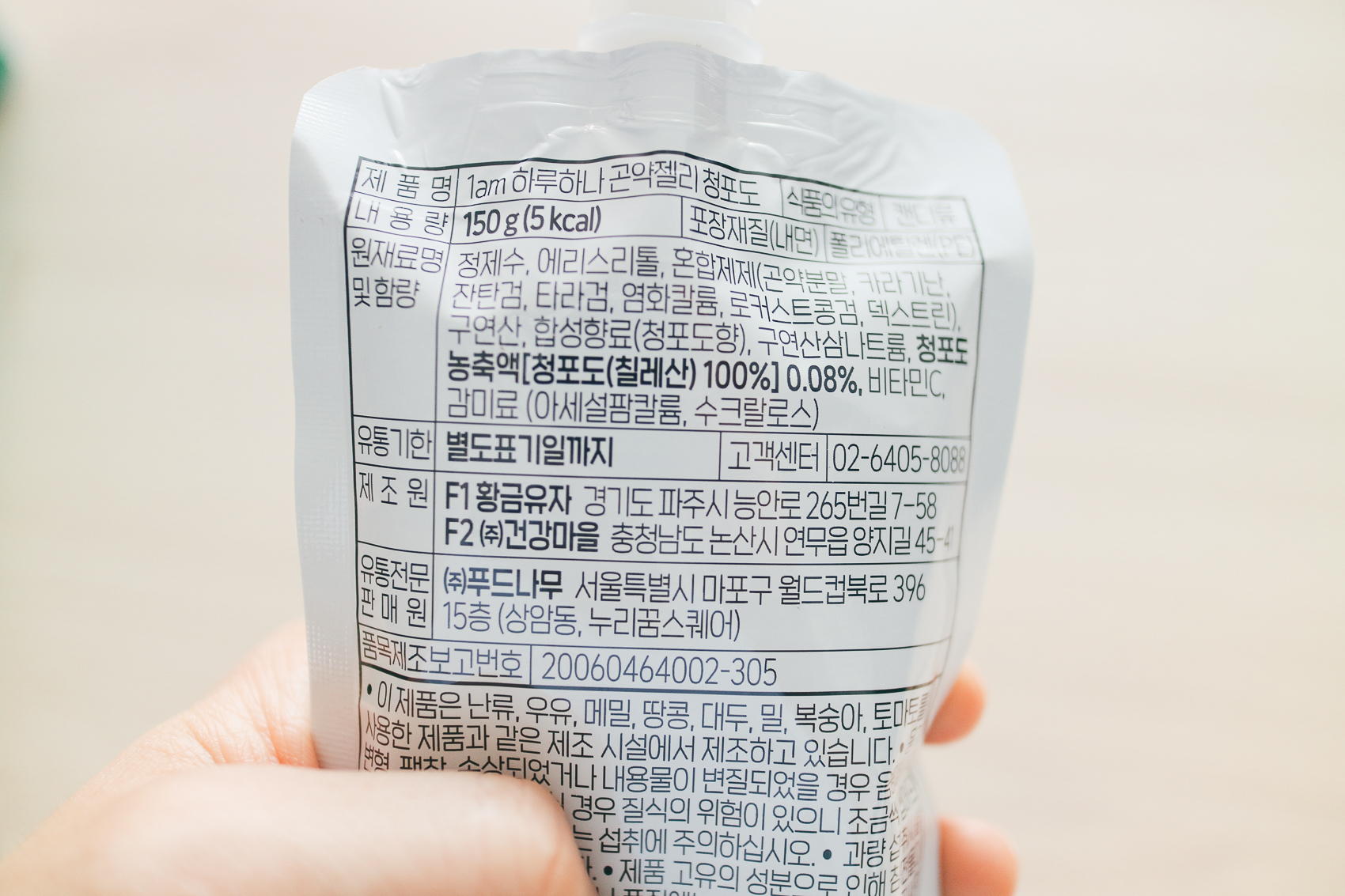 저번에 구매하고 맛있어서 맛 별로 추가 구매를 하게 되었다. 일단 운동을 꾸준히 하는 나에게 칼로리에 부담이 없는 저칼로리에 무설탕 곤약 젤리 청포도는 정말 착한 간식거리이다