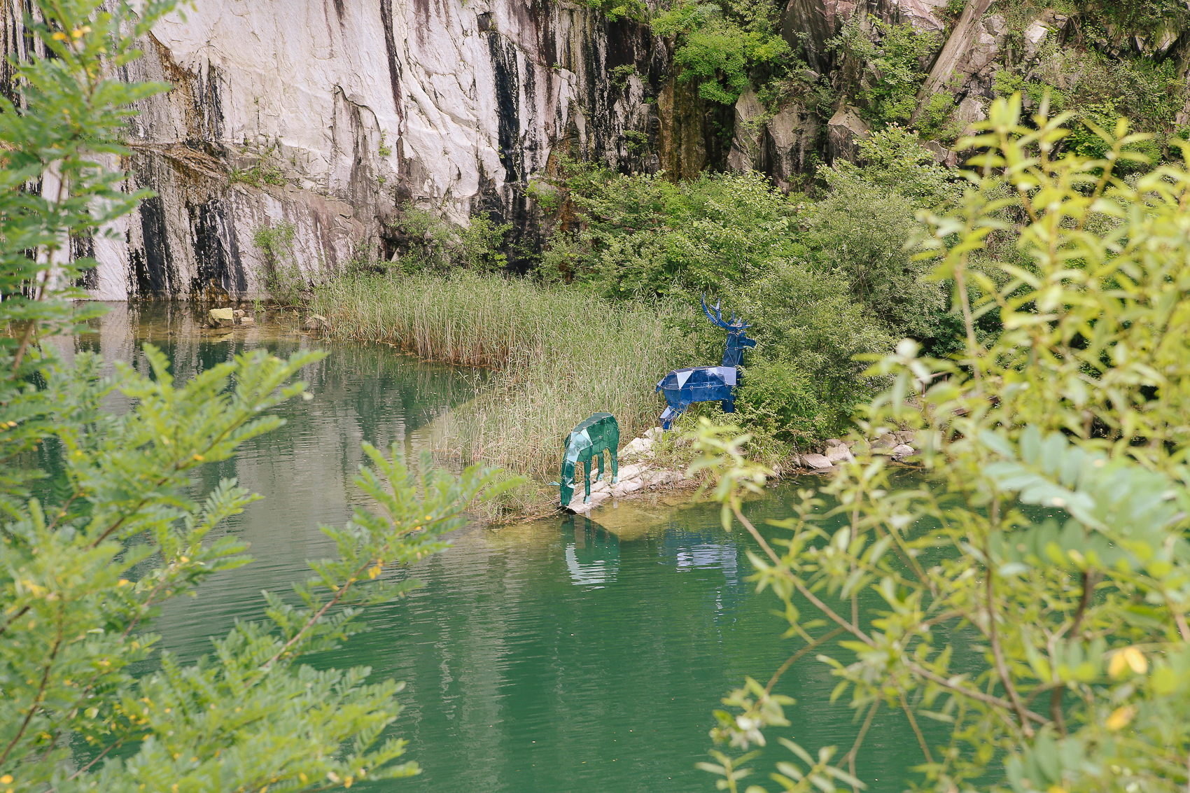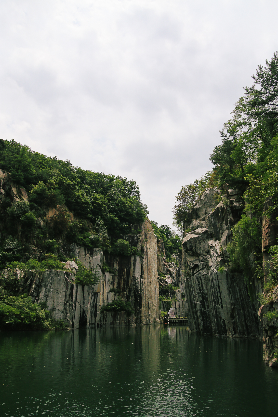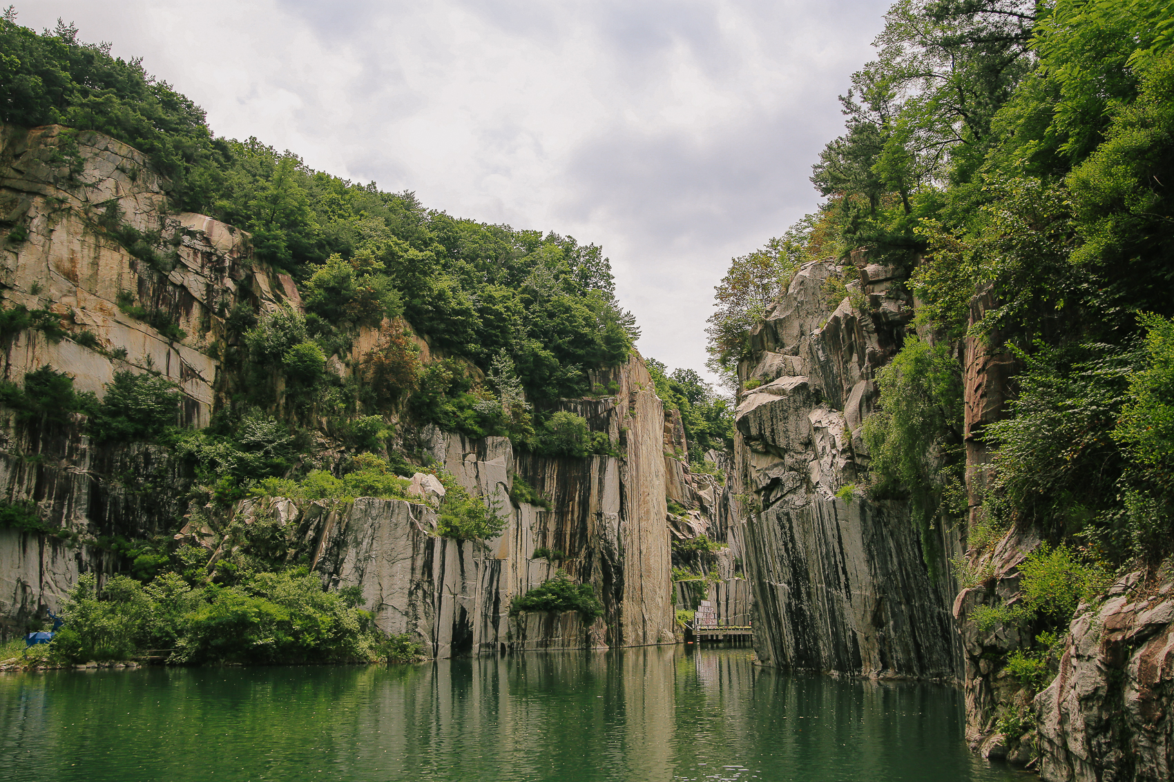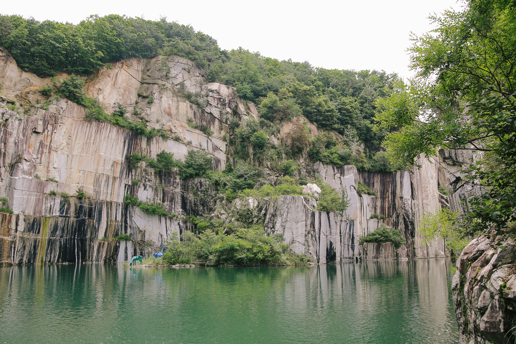 가장 보고 싶었던 천주호 전경. 천주호는 화강암을 채석하며 파들어갔던 웅덩이에 샘풀과 우수가 유입되어 형성되었으며, 호수의 최대 수심은 25m로 가재, 도롱뇽, 버들치가 살고 있는 1 급수라고 한다. 호수에 가라앉은 화강토가 반사되어 에메랄드빛 호수가 되었다.