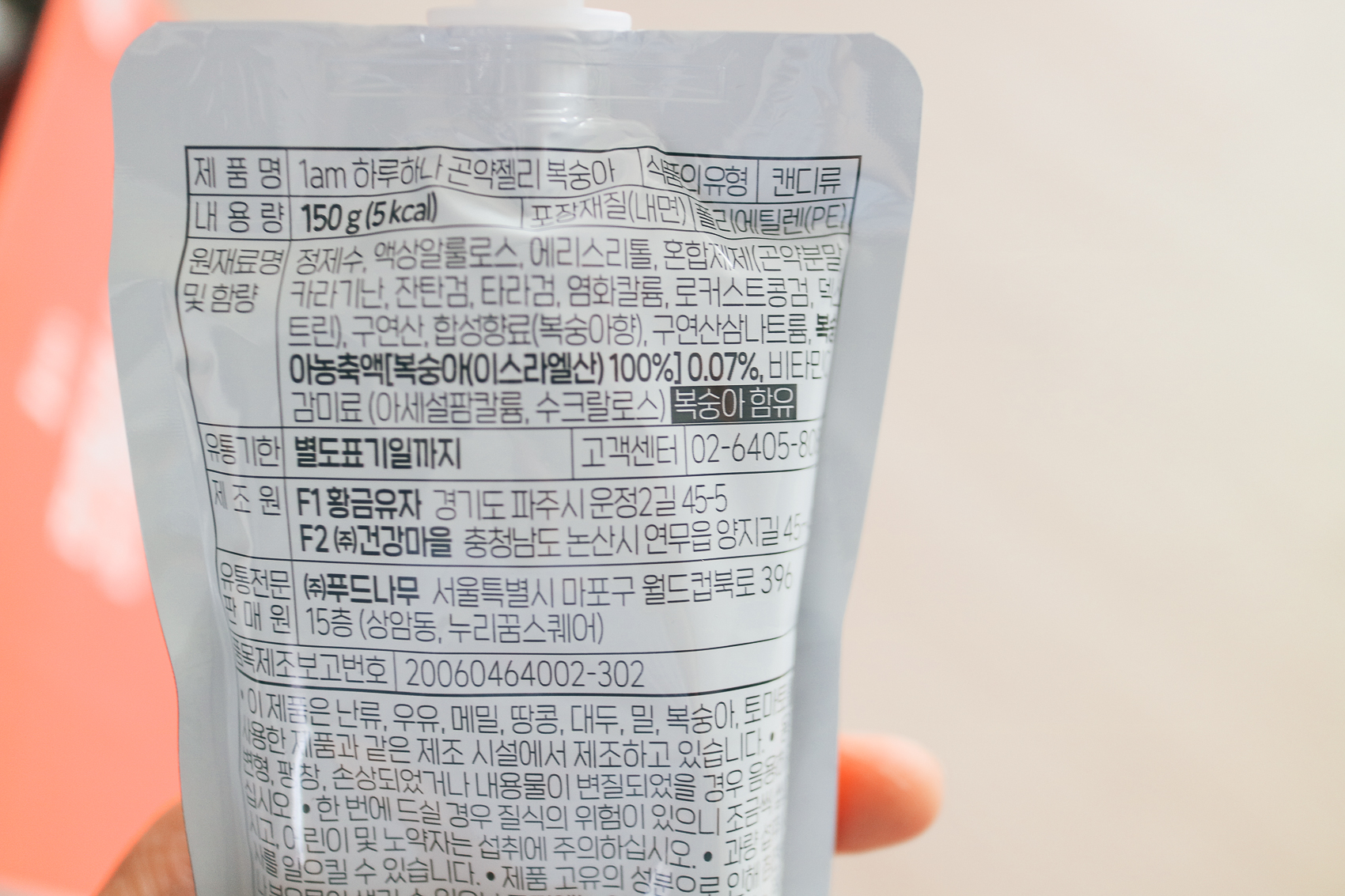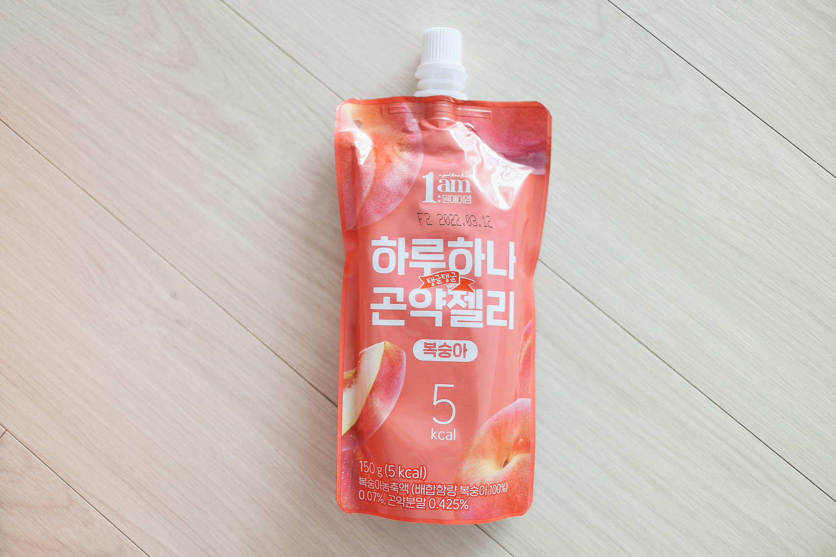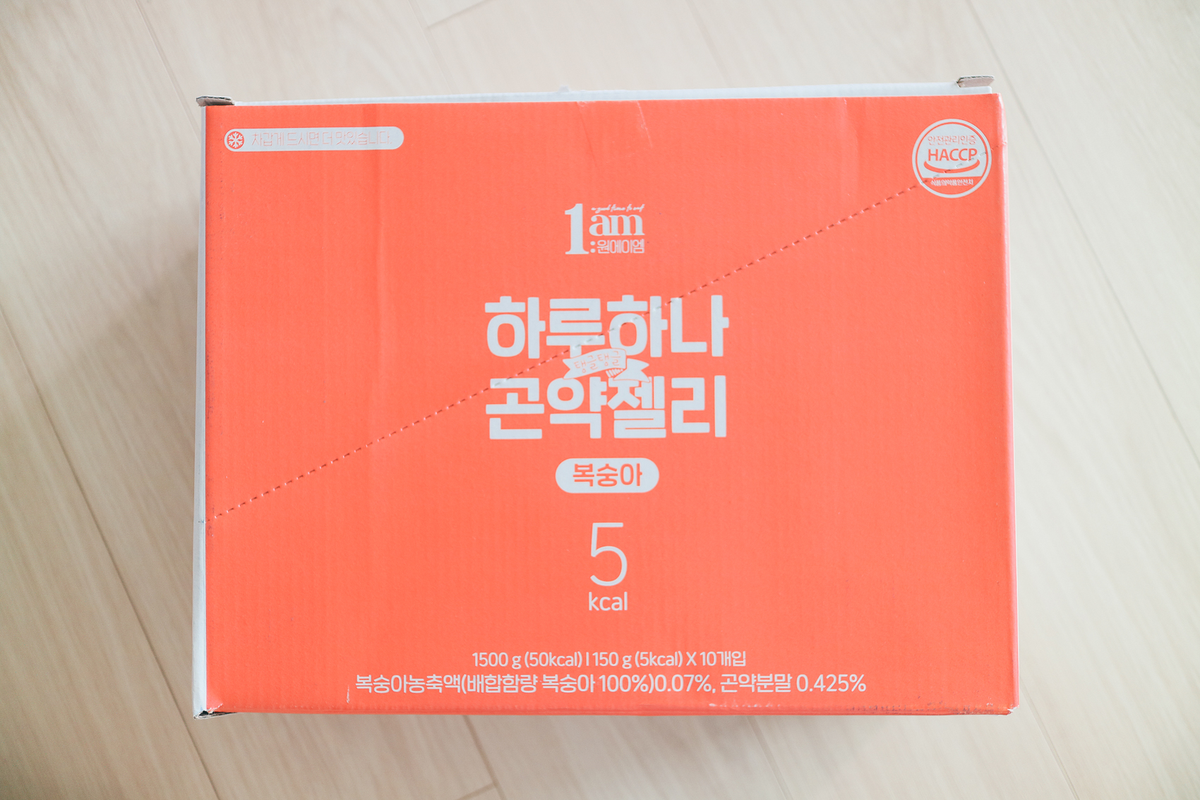 이번엔 1am 하루 하나 곤약 젤리 5kcal 저칼로리 복숭아 맛! 역시 10개를 구매하여 한 박스로 배송되었다. 패키지는 각 제품의 컬러를 준 투톤으로 깔끔하게 제작되어 굉장히 포인트가 사는 느낌이다. 이번에는 탐스러운 복숭아 감성을 담은 복숭아 맛을 구매하였다.