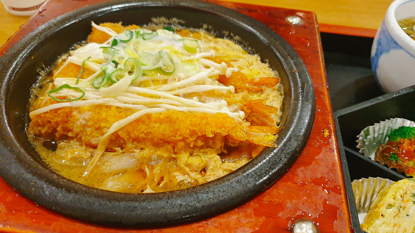 새우나베정식은 바삭한 빵새우를 기소야만의 특제 소스에 끓인 나베요리이며 다소 부족할 수 있는 양이 아쉽긴 하지만 밥과 함께 비벼 먹으면 더욱더 고소하게 즐길 수 있다. 바삭한 빵 새우와 특제 소스와 어우러지는 계란의 고소한 맛이 일품이라고 할 수 있다.