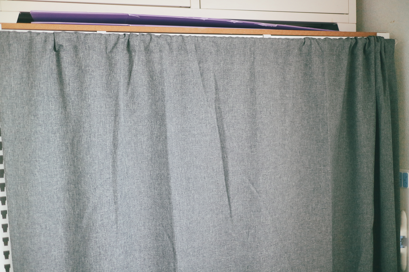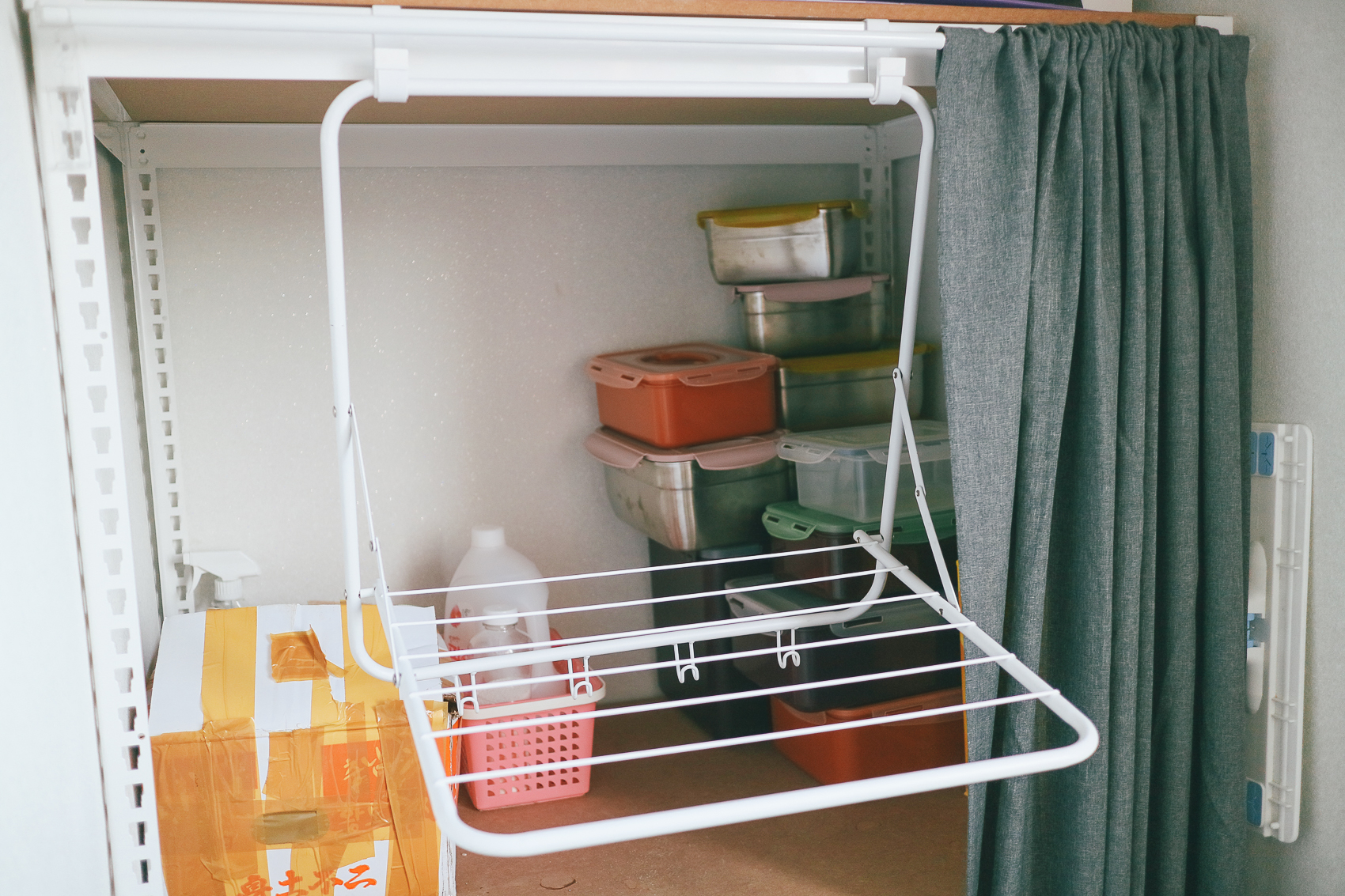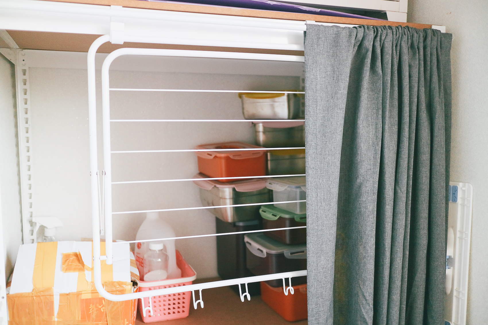 다시 미사용 시에는 고정 후크를 활용하여 접어두고, 스피드랙 선반 커텐을 쳐놓으면 아주 깔끔해진 모습! 미사용시에는 깔끔하게 커텐으로 가려놓고, 사용시에는 ㄴ자로 펼쳐 미니 모노블 접이식 문걸이 빨래 건조대를 사용하면 된다 :)