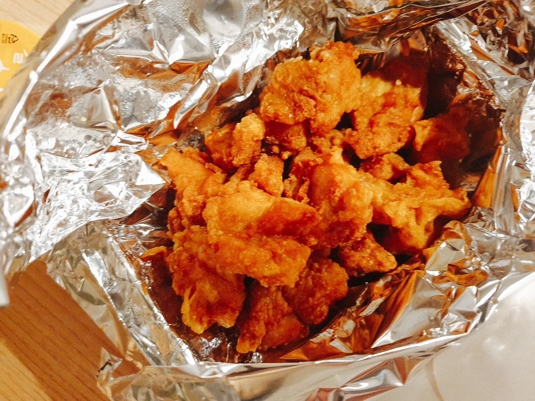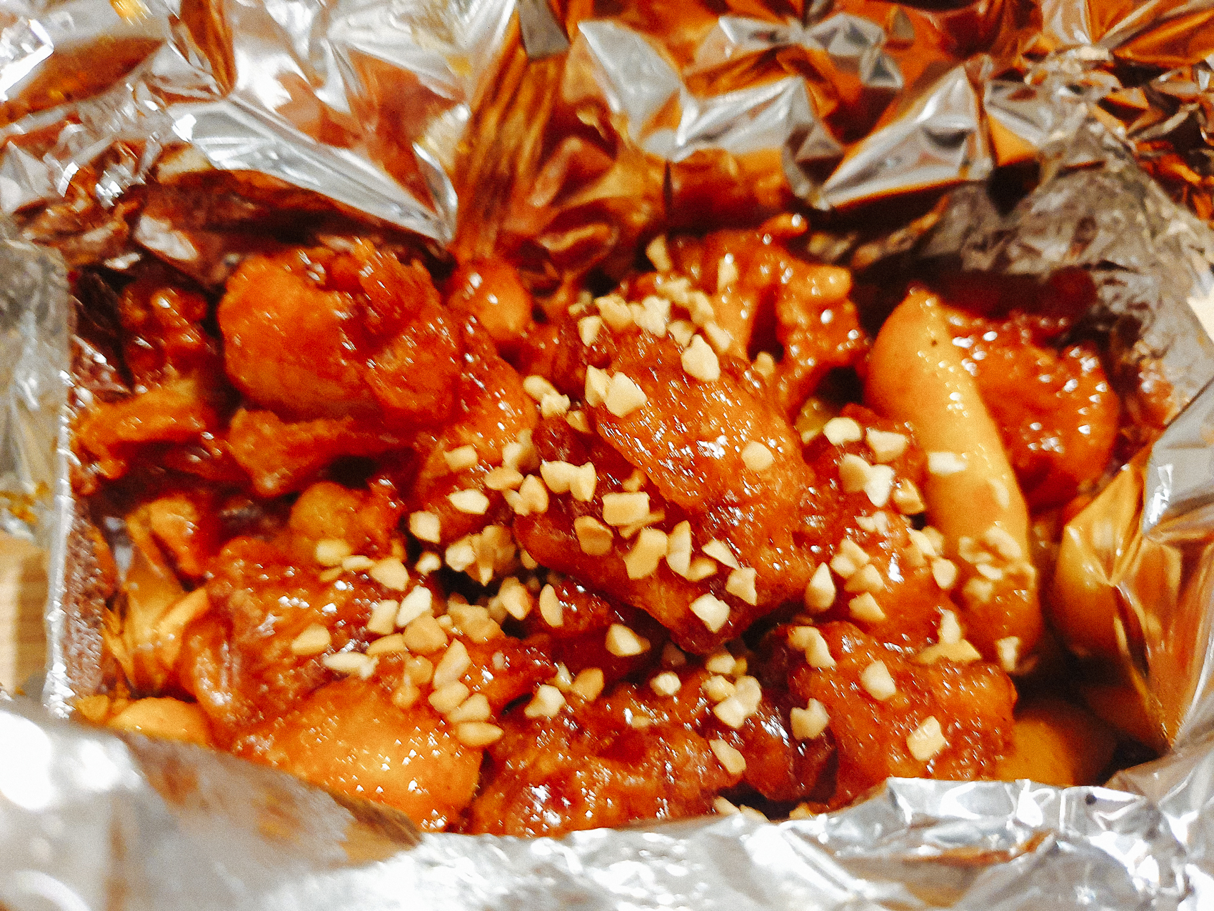 약간 매운맛의 양념 닭강정. 떡볶이 떡과 땅콩으로 보이는 가루와 함께 굉장히 조화로운 맛이다. 은은하게 매콤한 맛이 매력적이었던 양념 닭강정이었다.